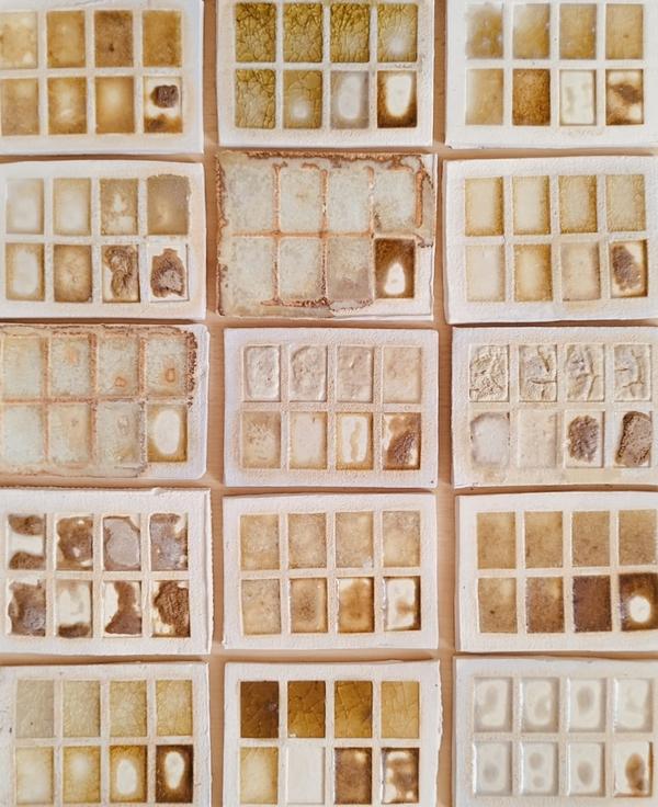 La 1ª exploración por la campiña de Jerez sirvió para recolectar los primeros sarmientos, racimos secos y albariza. que nos permitirían crear cenizas para probar los primeros esmaltes en unos muestrarios de gres traídos por Estelle Jullian desde Valencia.